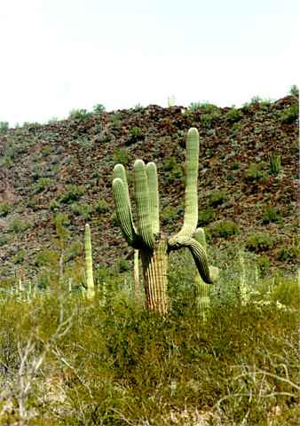 Many times while driving the Arizona back roads I see what I call not normal Saguaro cactus. By this I mean the arms do not seem to formed just right, and so I will take the time to photograph them and put the photo in my collection of cactus photos. On the left is a Saguaro and I don't know what has happened to the main stalk but it is missing. So, I shall call this one, |