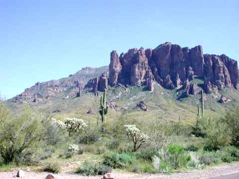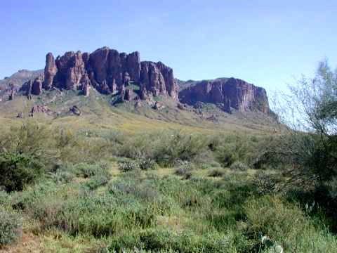 Driving up the hill into the Lost Dutchman Park here is the first scene to meet your eye. As you drive into the parking area there are a few more views of the mountain. I know it's hard to see but, the yellow going up the mountain side is fields of Arizona & California Poppies. We'll get a closer look later on.