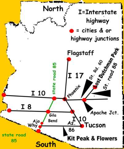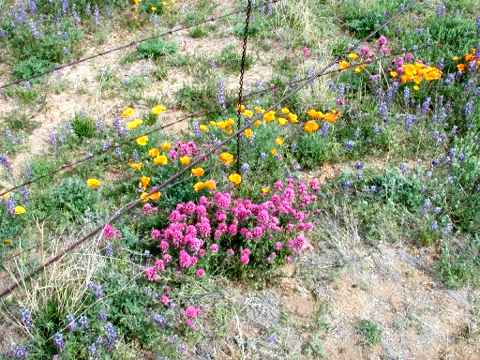 Well, since we are headed south, let's keep on going. This road will end in the town of Gila (HEELA) Bend. Turn right or south on state road 85 and continue to the town of WHY. Just north or just before you get into the town turn left (east) onto state road 86. About 3 miles before you get to state road 386 that takes you to Kit Peak you will see a sight that is almost unexplainable. The edges of the road and the fields on the north side of the hwy. are solid yellow with blues and purples mixed in. It would be an insult for me to add any thing to these photos so, I will put them on for you enjoyment.