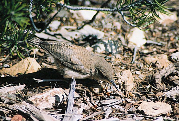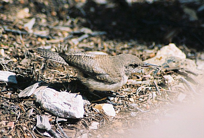 As it turned out, it was a very cute Canyon Wren, in fact there were several of them rooting around under my chair and between my feet, maybe I had dropped some bread crumbs or some thing they thought was good to eat.