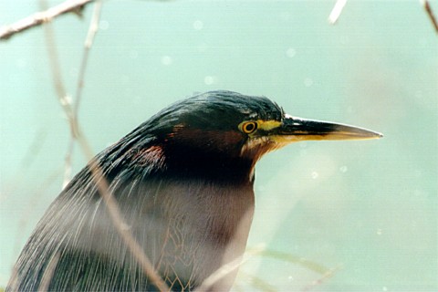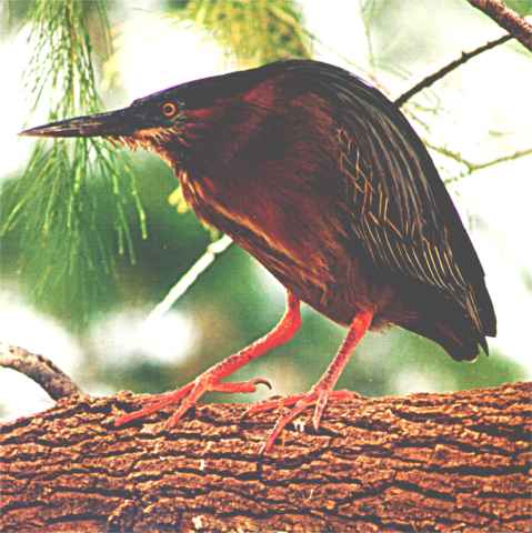 Will note that this Heron is a much shorter legged Heron than most herons, in fact this heron is smaller than most of the other Herons. It's approximately 18 to 19 inches in length and about 26 inch wing span. I have found it hard to see the green on these birds at times. It has a black cap. Its throat is white and rufous or chestnut on it sides. I generally see these in trees along water or standing in the shallow water along the shore.
