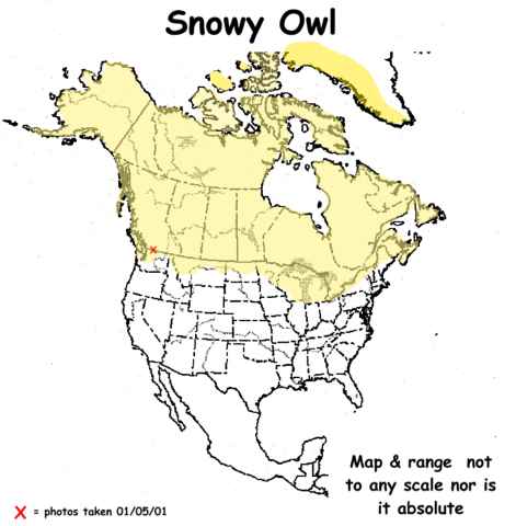A large Owl approximately 2 feet tall. Eats mostly Lemming and the food supply runs low it has been known to be seen as far south as central California, north Oklahoma & Alabama. In extreme winter they will migrate southwards and may be seen in many parts of the states.