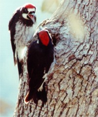 Two male Acorn Woodpeckers arguing over the rights to this storage hole.