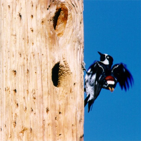 This pair of Acorn Woodpeckers are sure hard on the siding on this cabin.