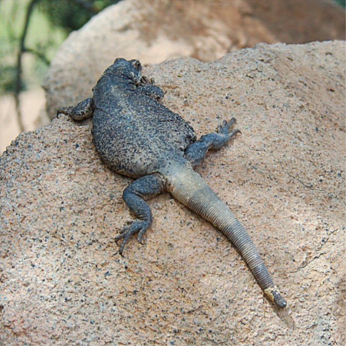 A large potbellied lizard. Normally seen as in above photo. You most generally find this lizard on large rocks, and it will scurry off and hide at the slightest movement or being frightened. In the mornings you could see it sunning it self on a rock. It like to have its body temp. to around 100 degrees before it starts off to find food. This is a herbivorous feeder.