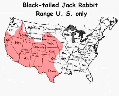 Approximately 25 inches long. Its tail has a black stripe on the top side extending on to its rump. Extremely long ears with a black tip on the to ends. This is not really a Rabbit but rather it is a Hare. Its young are born with a good coat of fur and they have their eyes open at birth. During the day it is inactive resting in the shade if possible and then becomes active in the late afternoon and night. I would venture a guess that it could weigh up to 20 pounds in some cases, and when it walks its back could be as high as 18 inches.