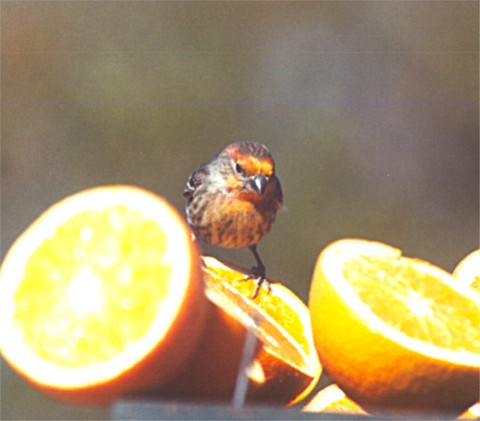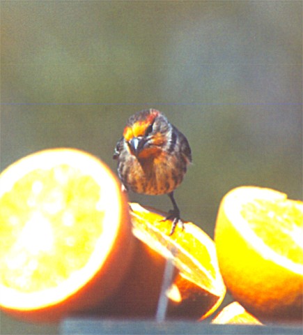 As soon as the seed and oranges are out and I stop moving around the Finches and Sparrows flock in by the hundreds. As a rule I don't pay them much attention however one Finch did catch my eye. It was a bright orange, so I fired off a few shots of it. I have never seen an Orange Finch. I know it's still just a House Finch but it's just that I have never seen an orange one out here before.