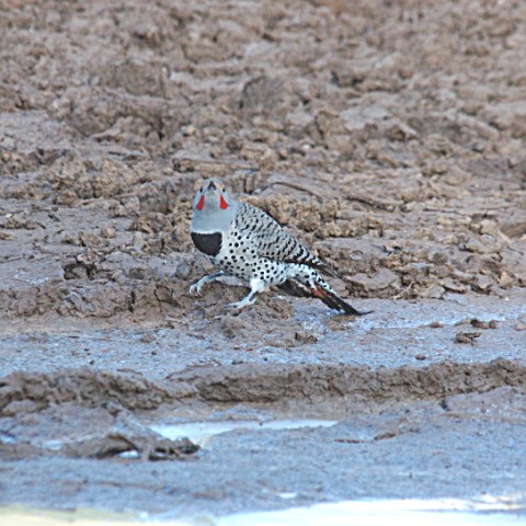 A rather large bird about 12 to 14 inches. White to off white or some times buffy breast with black spots. Wings and back same off white with black bars. They also have what I call a black bib around their throat on the front side, sometimes called a necklace. There are 2 types. A Red shafted and a Yellow-shafted. These also can be confused with the Guiled Flicker. The birds you are about to view here are "Red-shafted Northern Flickers". These Flickers lack the RED patch on their nape as the Yellow-shafted Flickers have. The book says these are Red-shafted Morph.