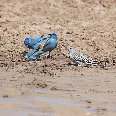 A female Northern Flicker "Red-shafted" with 3 Pinyon Jays.
