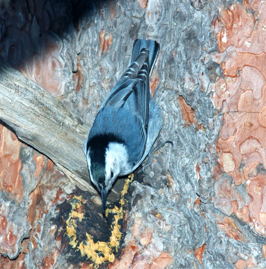 Yep, I was right, & there he went directly to the peanut butter in or on the tree bark.