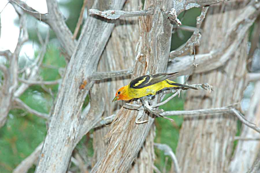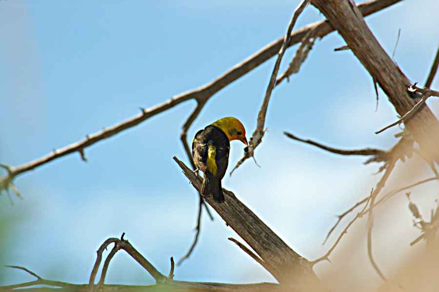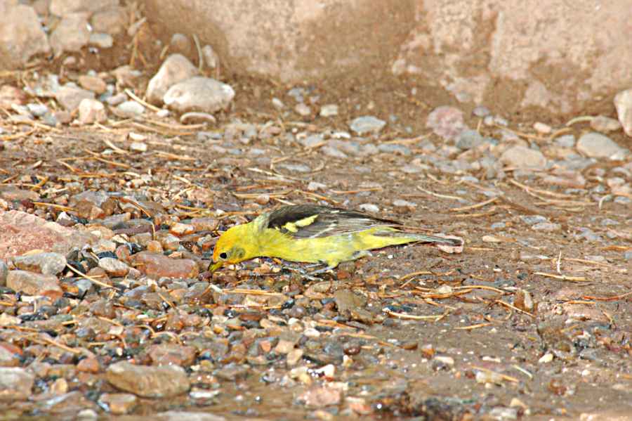 Lurking in the branches of the tree right over the dripping fountain, I believe it is going to come down and drink.