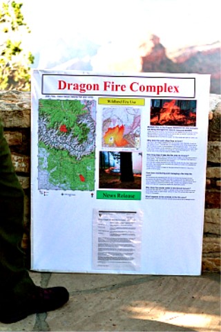 Out side the Bright Angel Lodge on the south rim a park ranger stood with a placard telling all about the fire. He said it was caused by a lightning strike.