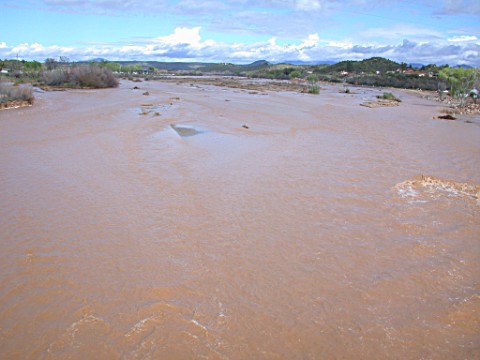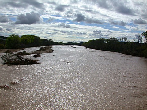 Under an Ominous sky the normally dry river roars.