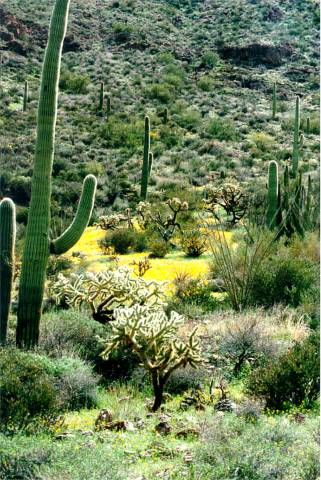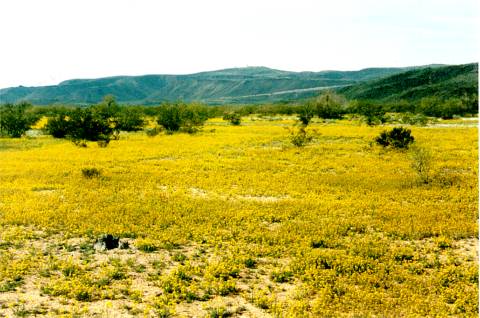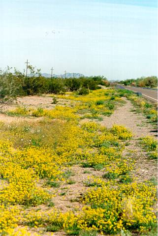 March, April, May are very good months to view the road side wild flowers of Arizona. Right now many of the roads in the south half of the state are in full bloom. Many of the mountain sides are yellow with the Brittlebush's bright yellow blooms. Many of the fields for as far as you can see are covered with a bright yellow carpet of Arizona Bladderpod blooms. |