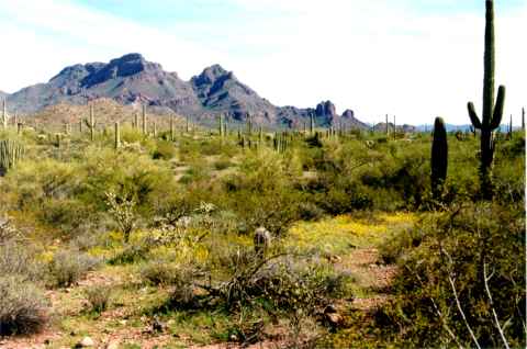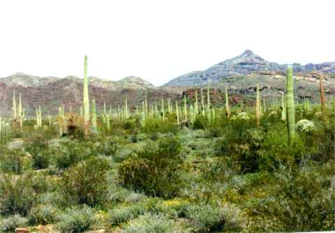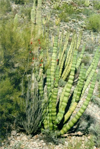 | If you look closely you can see small red flowers, approx. center left. This is a Ocotillo "Oc-o-tee-o" in bloom. The cactus on the right is an Organ Pipe cactus. |