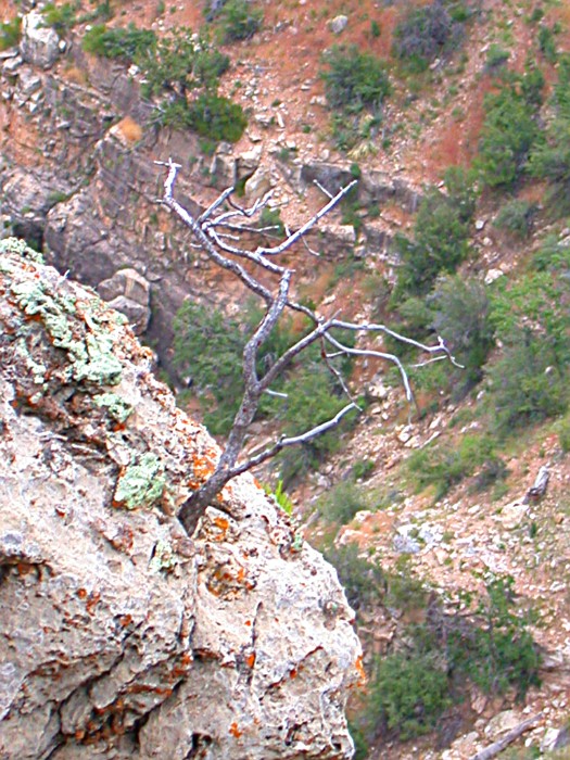 By the way this tree is not dead. I climbed down to it and its branches were not brittle indicating it was only dormant and had not began to grow again this summer.