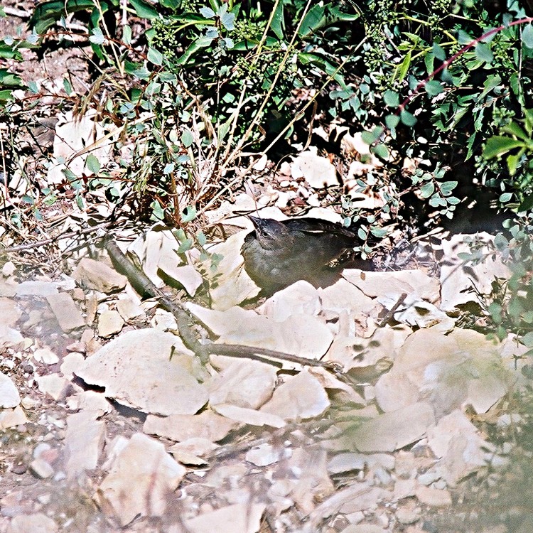 In my first look over the edge I thought I saw a baby black bird. I saw the bird fly into a bush while standing but lost track of it so I had to look over the edge. Sure enough, but I did not know what it was at the time, I just started taking photos.