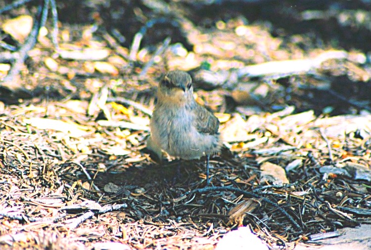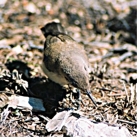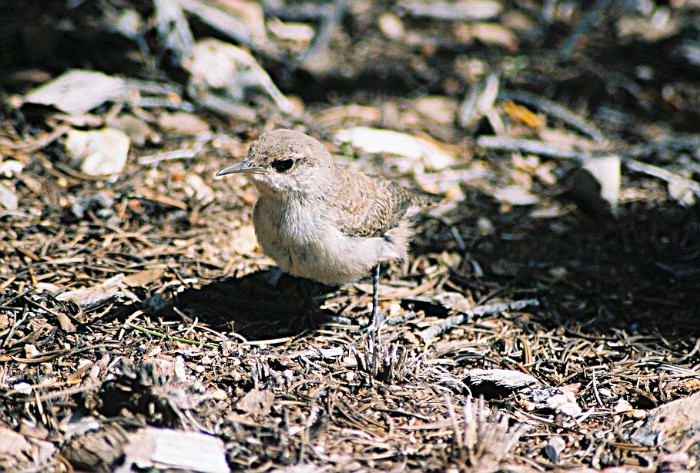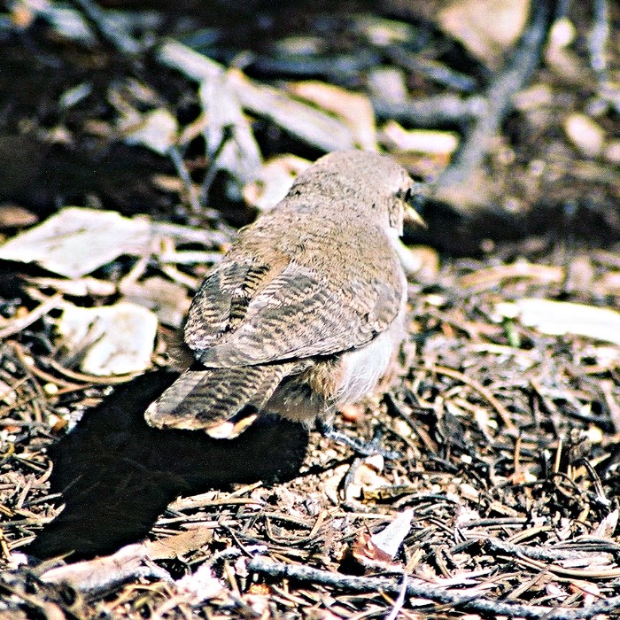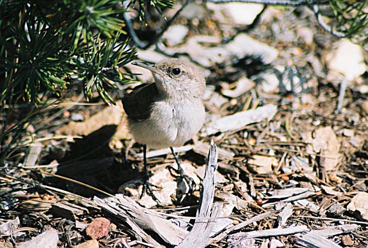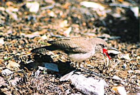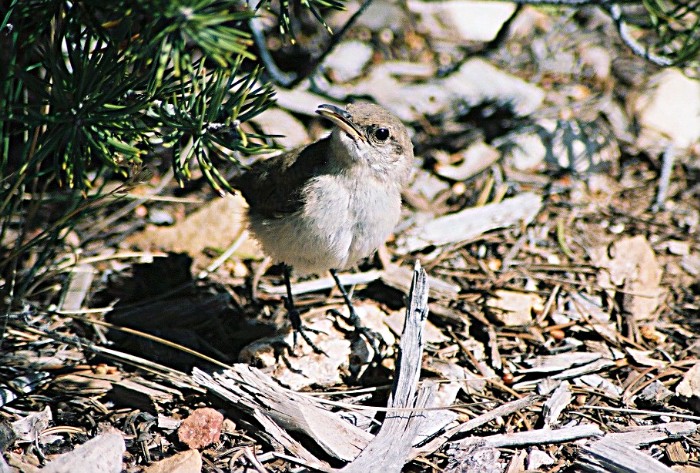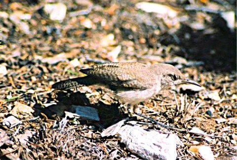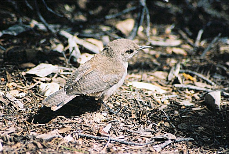As it turned out, it was a very cute Canyon Wren, in fact there were several of them rooting around under my chair and between my feet, maybe I had dropped some bread crumbs or some thing they thought was good to eat.