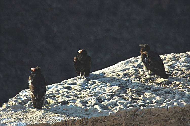 3 Condors looking west in the evening & watching the sun set from a top this large rock.