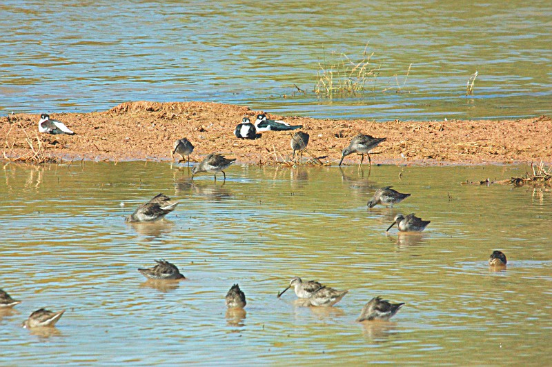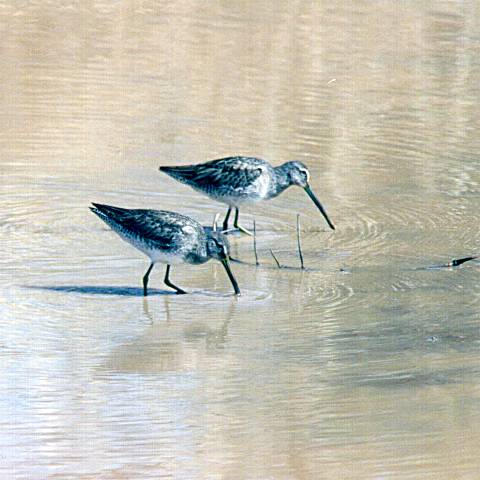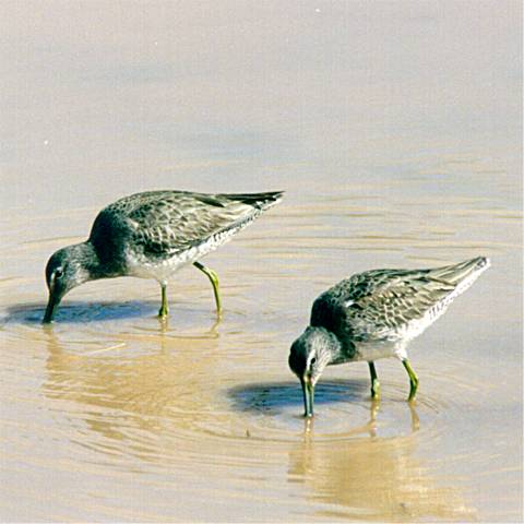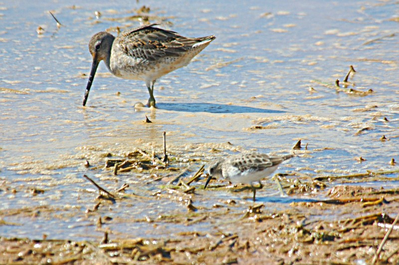 Long-billed Dowitcher in the back ground, Least Sandpiper in the forground.