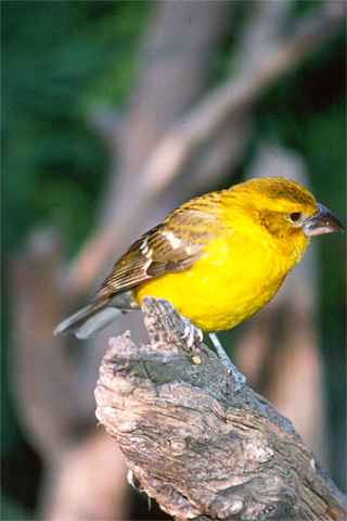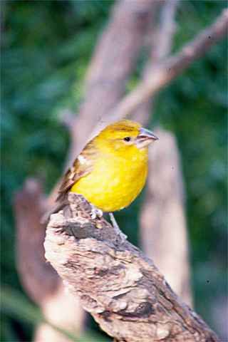 This is primarily a Mexican bird. Occasionally is found in south eastern Arizona in the early summer. Not the very large bill. The female is much duller and the top of their head has streaks in it. The photos here are of the male Yellow Grosbeak .