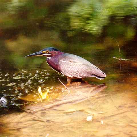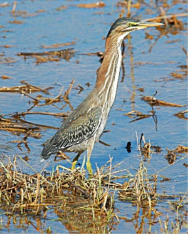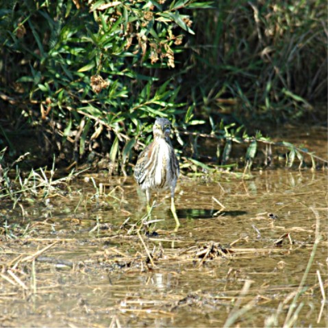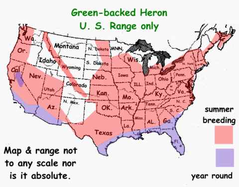 Will note that this Heron is a much shorter legged Heron than most herons, in fact this heron is smaller than most of the other Herons. It's approximately 18 to 19 inches in length and about 26 inch wing span. I have found it hard to see the green on these birds at times. It has a black cap. Its throat is white and rufous or chestnut on it sides. I generally see these in trees along water or standing in the shallow water along the shore.