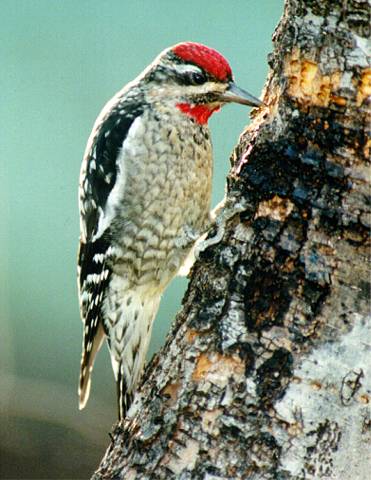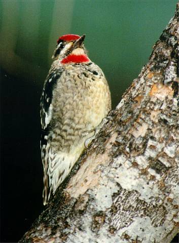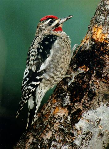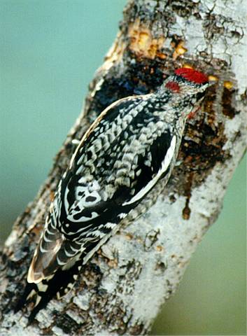 The Red-naped Sapsucker pecks a way the bark in very small square and rectangular shapes so the sap will run out. I'll try to show these holes. The bird also eats insects.