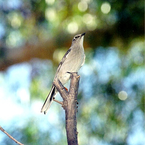 A very slender bird mostly gray. You will generally see it perched on a bare branch in the top most part of a tree.