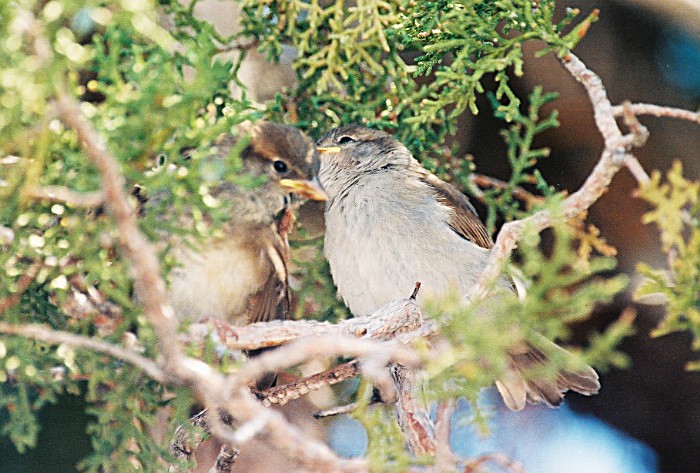 On my way to load up for home I spotted some young sparrows in a tree being feed buy their parents.
