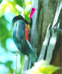 Male Trogon feeding young in nest cavity. |