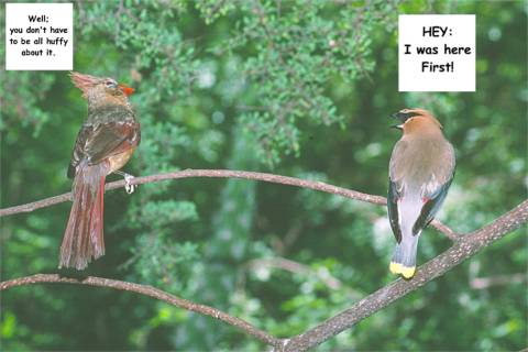 Now just what do think the Waxwing is saying to the Cardinal?