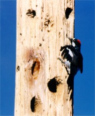 This pair of Acorn Woodpeckers are sure hard on the siding on this cabin.