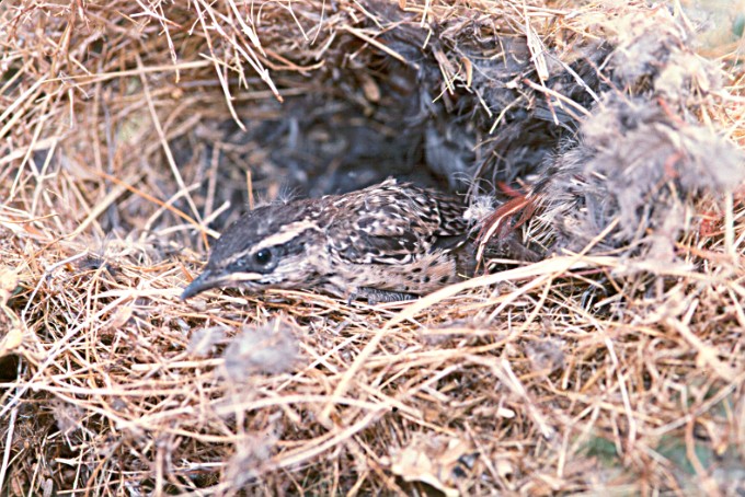 It's a rare sight to see a young Cactus Wren looking out of the nest entrance.