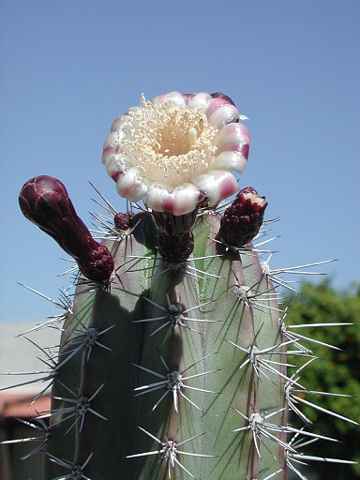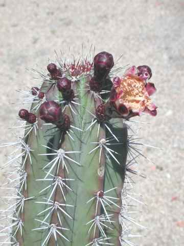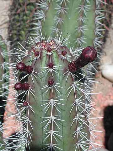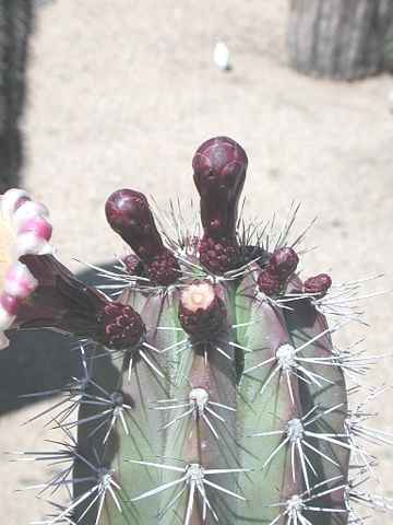 Mature plants form stately clumps of tall slender blue-green stems studded with distinctive black spines. Once the stem is 3 to 4 feet tall it blooms several times at night in the summer producing funnel shaped blooms of pink, white or green. The round or oval edible fruits are green, red or purple. Originaly from Eastern South America.