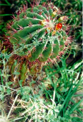 There are about 35 species. Known as barrel cactus because of their shape or fish hook cactus for their spines. Large funnel shaped yellow to violet blooms. very sticky yellowish berries that secreate a sweet substance appear in the plant's crown in summer to atract pollinating ants