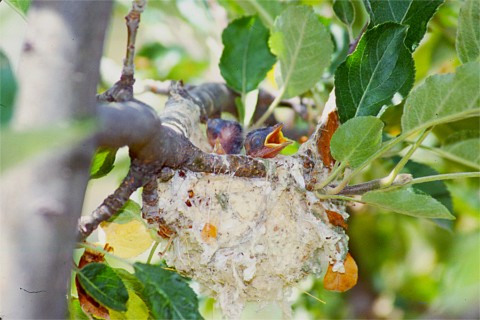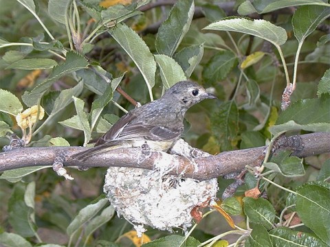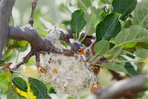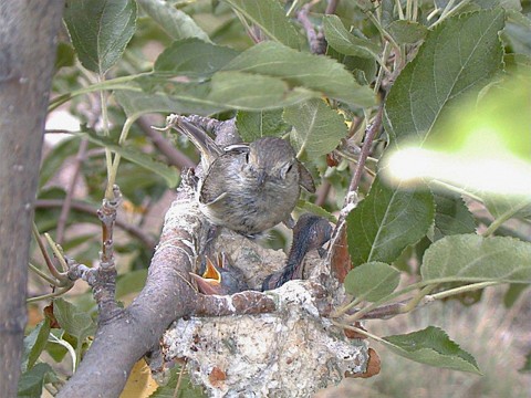 I studied the nest for about an hour in order to determined the time period between feedings. This would tell me how much time I would have to get my camera equipment in place with out the parent birds seeing me do it. This was mid after noon, and the feedings were running 25 to 35 minutes a part. As soon as the parent bird left the nest I made a Bee line for my car. Down the hill I ran, got as much equipment as I could and scurried back up the hill. You see the nest was quite a ways up the hill from the cabin. One more trip as fast as I could go. The old ticker was really pumping by now. Just as I got my last piece of photo equipment to the nest area the parent bird showed up to feed the chicks. I really needed that few minutes rest, I was breathing like a steam engine going up a mountain by that time. After about 5 to 10 minutes Mom, or Pop, as the case may be, left the nest to get more bugs. I quickly set up four cameras and two mirrors. Two of the cameras were Nikon F4's and two were Nikon digital cameras. I'll let you figure out which images were taken with which camera. Over half of the images used here were taken with the digital camera. At the end of the page I will say which were digital images.