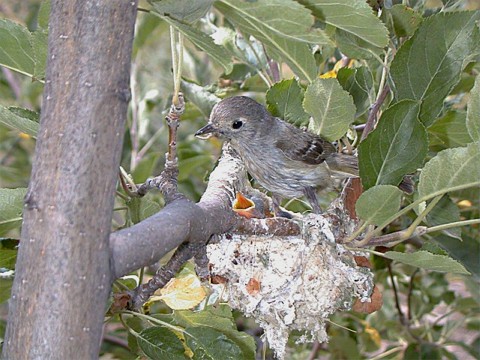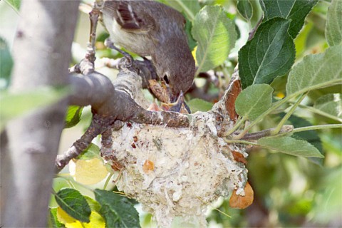 Remember I said it was a hot, muggy, breezeless day and the sun was beating down severely. The two parent birds coming to the nest each took turns shading the chicks.