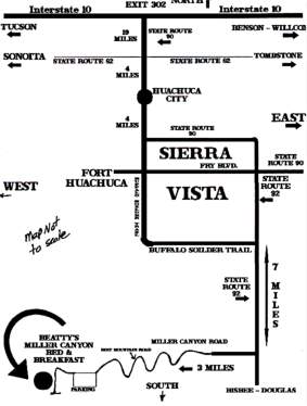 Six Bed & Breakfast/Housekeeping units, located in the Huachuca Mountains above trail head parking at 5800 feet & is 85 miles southeast of Tucson. The 10 acre property (100 yards by 1/4 mile) is 3 miles west of State Highway 92 on Miller Canyon Road and is completely surrounded by U.S. Forest Land.
