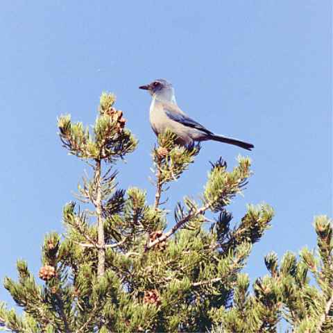 In the top of almost every tree were Western Scrub Jays packing away some kind of a pine goody.