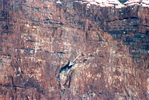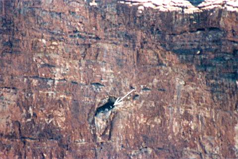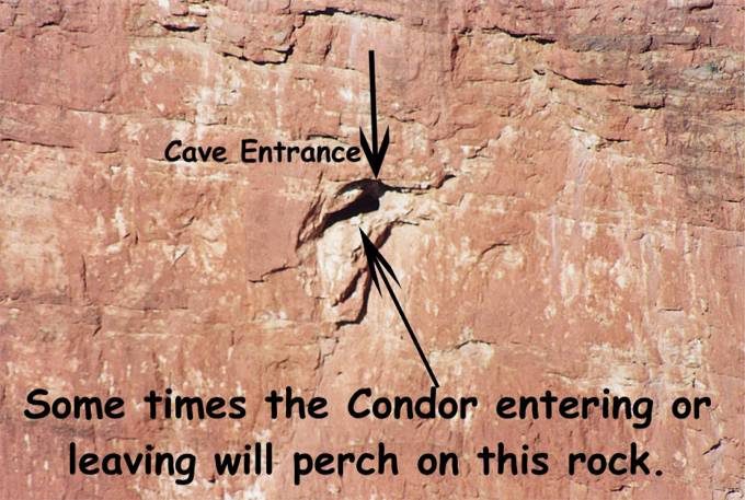 Last year a nest here failed. The park biologist repelled down some 170 feet or more to this cave entrance to see what possibly may have gone wrong. Remains found in the nest cave were from the pleistocene area which in geologic terms is from 10,000 to about two million years ago. The juvenile and adult condor remains were Carbon 14 dated from 11,000 to 23,000 years ago. Remains of of at least three extinct mammals were also found in the cave, an extinct horse, bison, and brush ox.