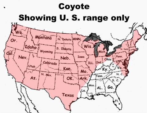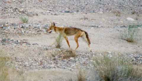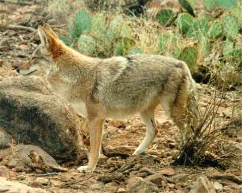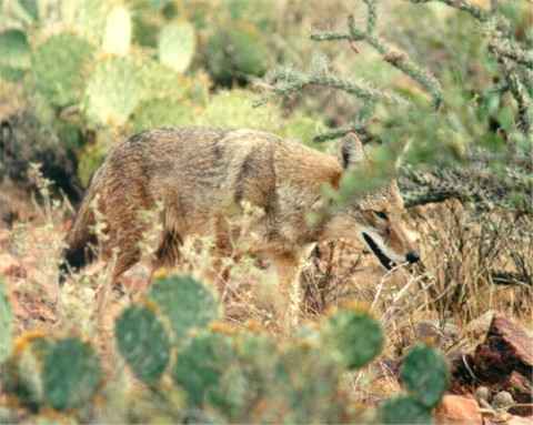 The Coyotes that live in and around the residential area of Sun City and Sun City West here in Arizona are pretty well fed. In fact I know several people who actually put out food for them. Some will approach within 10 to 15 feet of humans. I don't believe this is a good thing, but never the less it does happen. I believe the wild should be left wild. The Coyote range is from East Alaska, northern & western Canada, and most all of the United States. The Coyote runs at 25 to 30 miles per hour buy can get up to 40 miles per hour for short distances. Some Coyotes have been know to range as much as 300 to 500 miles. Also note when the Coyote is running it tail is always down. What do they eat? Most any thing they can catch plus any number of cactus fruits. I don't know how high a Coyote can jump, but I have seen them jump up onto objects that looked to be 10 feet high.