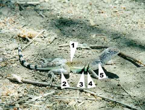 Arrows 3 & 4: are pointing to, 2 side stripes that wrap around the under side of this lizard, but not over the back.