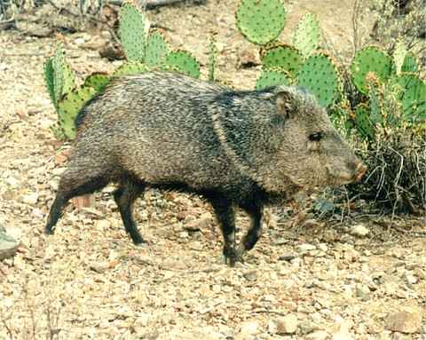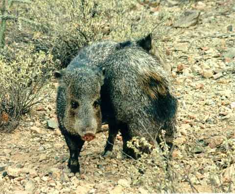 As I have view them, they always like to rub them selves on trees, big rocks, or each other. In the above photo you can see the inconspicuous tail on the one on the right of the image. If they become stressed I have seem raise their tails while running. Most of the time it roots in the ground for food. Many times you see it down on its front knees rooting or eating. It you will observe closely when they walk, it is on there front part of their front hooves. Food consist of the Prickly-pair cactus, Spines and all. This cactus also provides water for them. They also will eat mesquite fruit, lechuguilla.