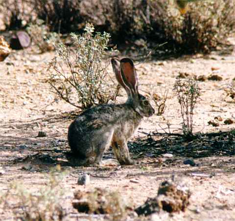 Approximately 25 inches long. Its tail has a black stripe on the top side extending on to its rump. Extremely long ears with a black tip on the to ends. This is not really a Rabbit but rather it is a Hare. Its young are born with a good coat of fur and they have their eyes open at birth. During the day it is inactive resting in the shade if possible and then becomes active in the late afternoon and night. I would venture a guess that it could weigh up to 20 pounds in some cases, and when it walks its back could be as high as 18 inches.