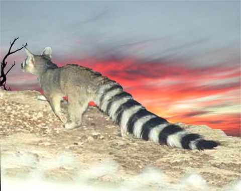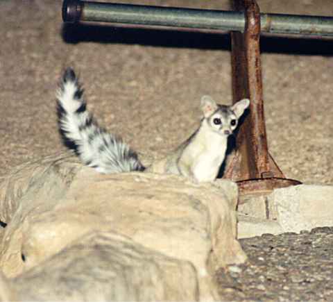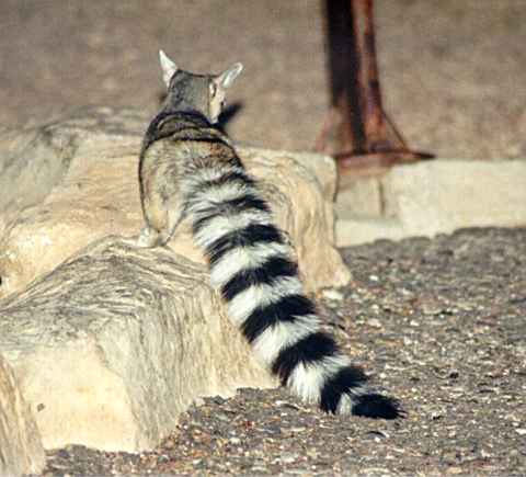 It can be up to approximately 3 feet long. It's sort of a gray-yellowish on the top side of the body, but much lighter on the under side. They call it a cat (ringtail) because its body resembles a cat's body, but has a face sort of like that of a fox. The tail is the most out standing thing about this animal, note how bushy it is. Also note the black rings on it. This one only has 7 rings on its tail. The books say it can have as many as 16. The tip is always black. If you were to turn the Ringtail over you would see that the rings on the tail do not meet on the under side. Please note the extra large eyes and ears, this is all the better see and hear you with. If you closely you can see a very pale eye ring, very light in color. There are 5 toes on each foot and I do not believe there is any difference in its foot prints from the front feet to the back feet. You may never see its tracks because it for the most part it lives in very rocky terrains. Inasmuch as I photographed it at the South Rim of the Grand Canyon right on the very edge proves its habitat as stated. The Ringtail sleeps by day and hunts it prey at night. It eats grasshoppers, crickets, very small mammals, small birds, spiders, and frogs if it can find any.