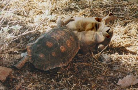 Male Tortoise often have these competitive bouts during the breeding season. They use the horn on the front of their lower shell to ram the other Tortoise in an attempt to over turn their opponent and thus by doing so establish their territory. The over turned Tortoise can and will right it self in a short time and go on it way out the victors territory.