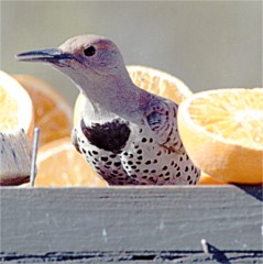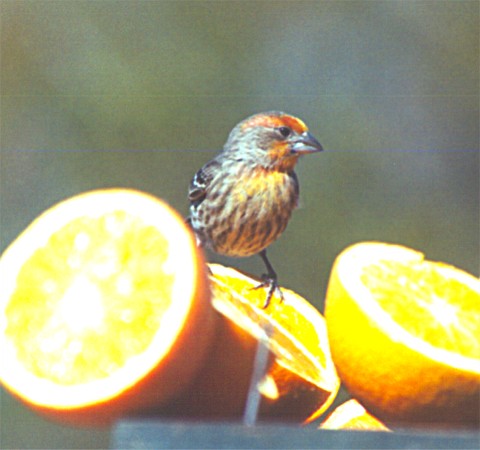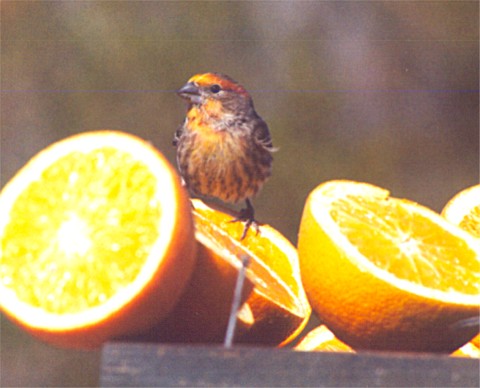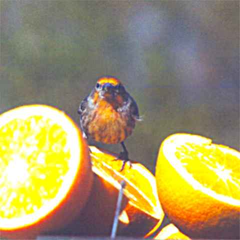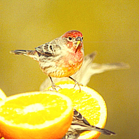 As soon as the seed and oranges are out and I stop moving around the Finches and Sparrows flock in by the hundreds. As a rule I don't pay them much attention however one Finch did catch my eye. It was a bright orange, so I fired off a few shots of it. I have never seen an Orange Finch. I know it's still just a House Finch but it's just that I have never seen an orange one out here before.
