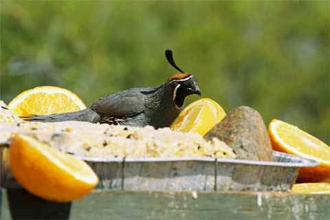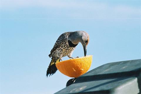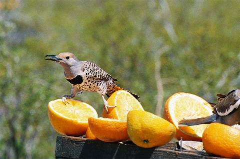Hey big boy, why don't you hop up there and sample those oranges and suet then let know if they are A-OK?