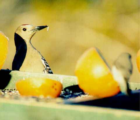 Bird up date while I was working. The Verdins are pecking at my oranges on the seed tray. Many Sparrows on the ground Black-throated, White-crowned, and a few others I cannot ID at this time. Also the Gils's are still coming to the seed try for the oranges. My working and moving around didn't seem to bother these birds.