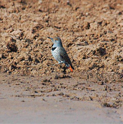 A rather large bird about 12 to 14 inches. White to off white or some times buffy breast with black spots. Wings and back same off white with black bars. They also have what I call a black bib around their throat on the front side, sometimes called a necklace. There are 2 types. A Red shafted and a Yellow-shafted. These also can be confused with the Guiled Flicker. The birds you are about to view here are "Red-shafted Northern Flickers". These Flickers lack the RED patch on their nape as the Yellow-shafted Flickers have. The book says these are Red-shafted Morph.